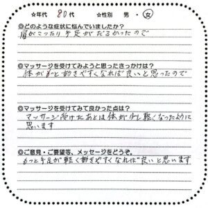 患者様の声 患者様の声 2026.03.25 80代 女性 どのような症状に悩んでいましたか? 肩がこったり手足がだるかったので マッサージを受けてみようと思ったきっかけは? 体がもっと動きやすくなれば良いと思ったので マッサージを受けてみて良かった点は? マッサージを受けたあとは体が少し軽くなったように思います ご意見・ご要望等があれば教えてください! もっと手足が軽く動きやすくなれば良いと思います 今後もお客様ひとりひとりに寄り添った 施術に努めてまいります。 ブログ一覧へ